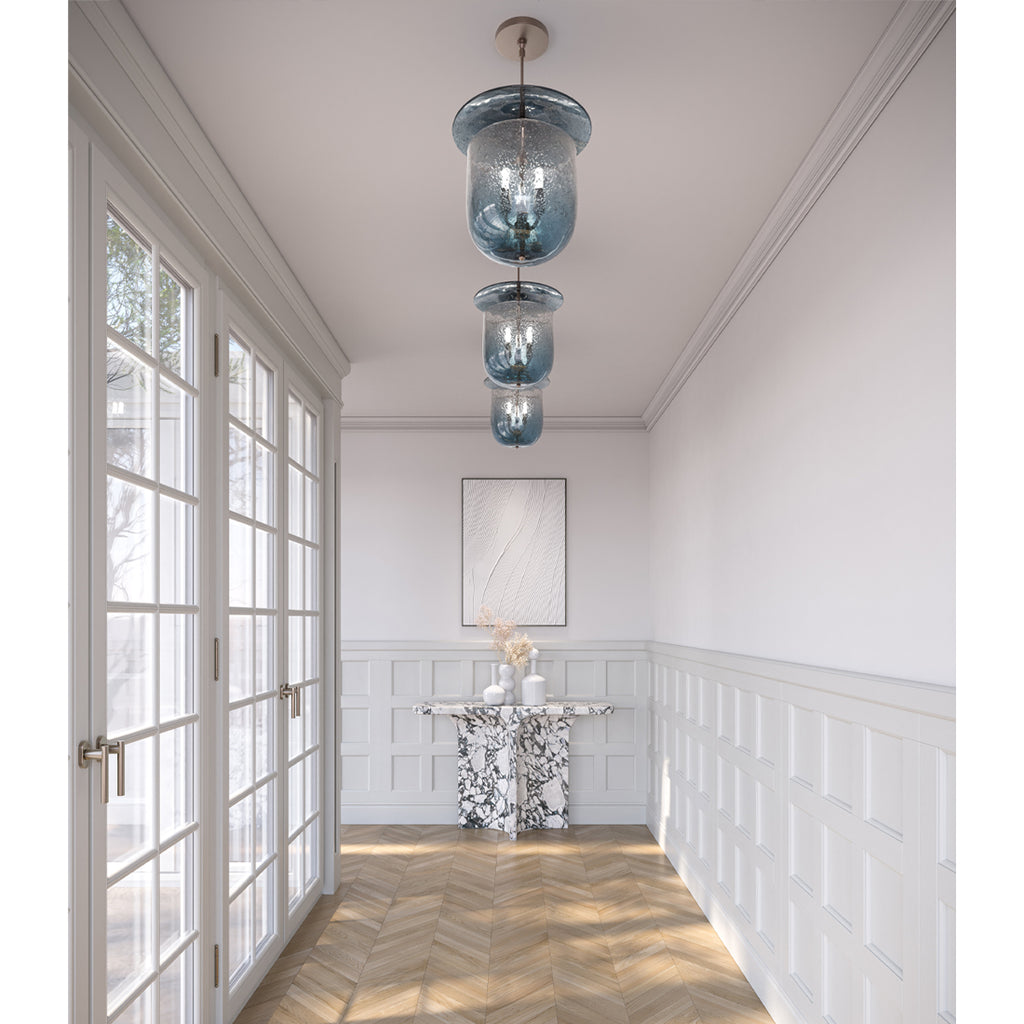 11.5" high Belljar with 14" diameter Lens-shaped lid in Steel Blue glass, Smooth pattern, with Black Oxide downrod and hardware