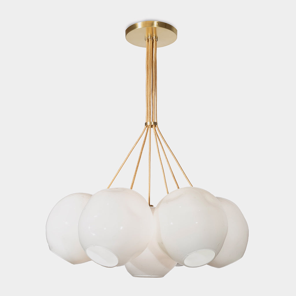 Seven 9" diameter Dimple diffusers in Primavera pattern, White color, 8" diam Round canopy, with Brushed Brass finish, and Gold Fabric cord; 27" diameter
